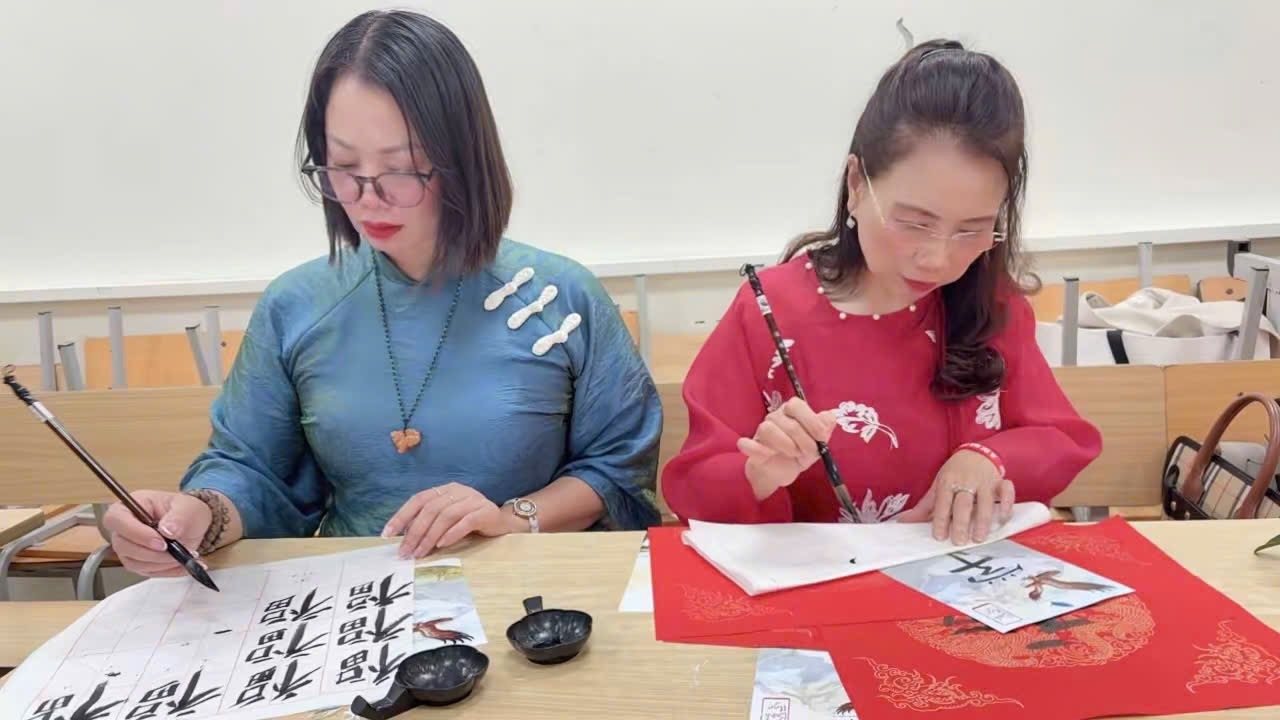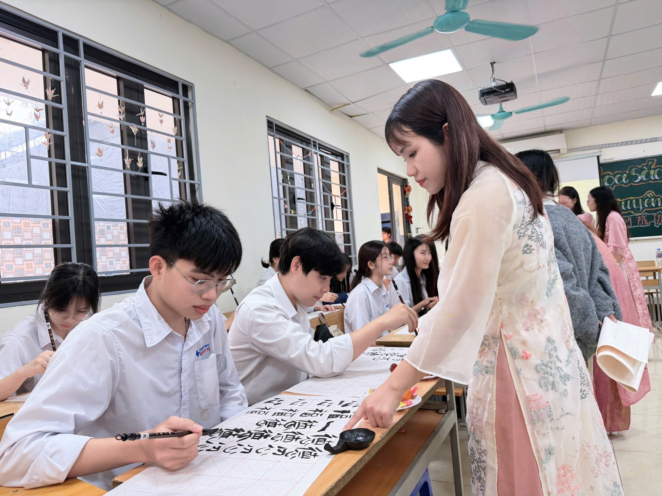 Tiếp nối mạch cảm xúc ấy, phần chia sẻ về nghệ thuật thư pháp của Cô Ánh, giáo viên tiếng Trung, đồng thời là nghệ nhân thư pháp đã giúp học sinh hiểu sâu hơn triết lý “Tâm trong mực – Ý trong chữ”. Thư pháp không chỉ là viết chữ đẹp, mà là hình họa của tâm tưởng: nét đậm vững chãi như núi, nét thanh linh hoạt như mây, và khoảng trắng – nơi tâm hồn được lắng lại giữa nhịp sống hiện đại.